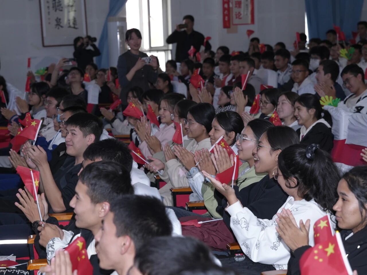 整场演出构思精巧,以“四季”为脉络,以“国学”为灵魂。男子独舞《墨韵中华》以刚柔并济的舞姿,将中国书法气韵与水墨山河壮阔展现得淋漓尽致。女子独舞《孔雀东南飞》则以轻盈曼妙的舞姿,深情诠释了古典叙事诗中的坚韧与追求。演出尾声,全体演员共同唱响《我和我的祖国》,引发全场大合唱,各族师生挥舞手臂,用真挚歌声表达对祖国的热爱与祝福。