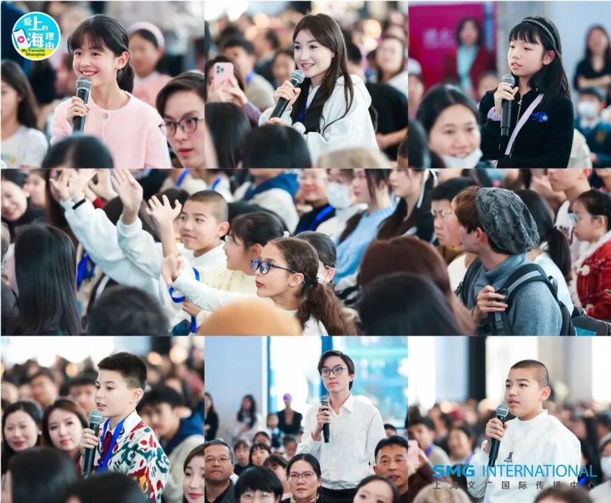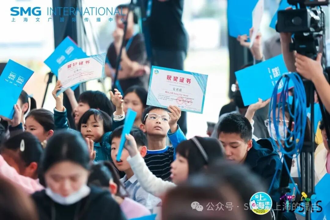“爱上海的理由”优秀作品颁奖活动邀请“明日之星”获得者参与,现场百余位孩子举起证书,对着镜头打招呼。