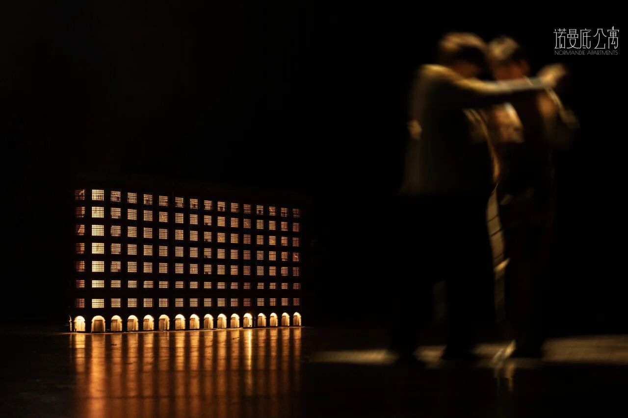 舞美设计巧妙呼应剧本的碎片化叙事,大大小小的诺曼底公寓模型在舞台上变幻莫测——时而与人等高,时而碎裂重组,时而整体移动。同时,舞台空间通过不同颜色的帘幕巧妙区隔,结合多媒体投影,瞬间完成公寓内不同房间、不同时空的转换。