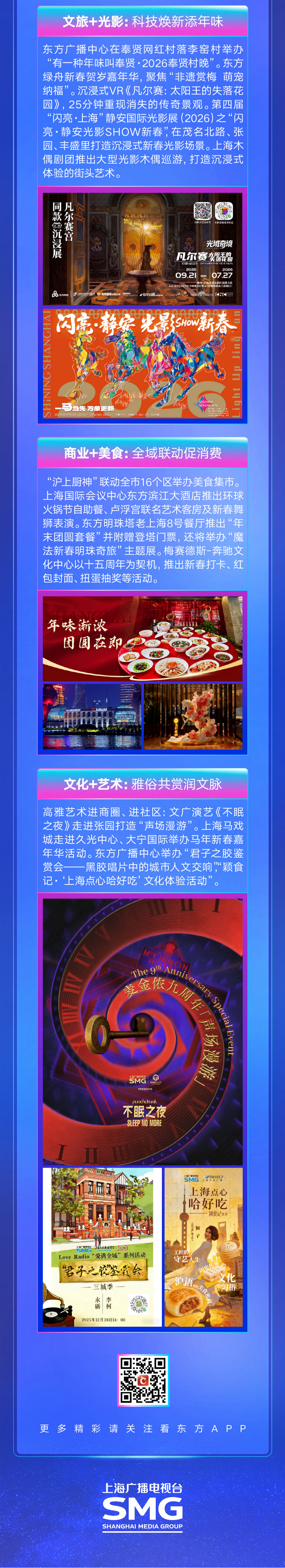 本次活动以“全媒体、多业态、都市型、国际化”为定位,以“大小屏协同赋能”为核心抓手,充分发挥上海广播电视台(集团)“链主”功能,整合旗下内容矩阵、线下演艺、文旅地标及台内外产业资源,精选推出66项优质项目,覆盖新年节目、经典IP、潮流体育、沉浸演艺等文化业态,以及教培、餐饮、酒店等生活服务领域,系统性打造迎新演出单、文旅打卡指南等内容产品。
