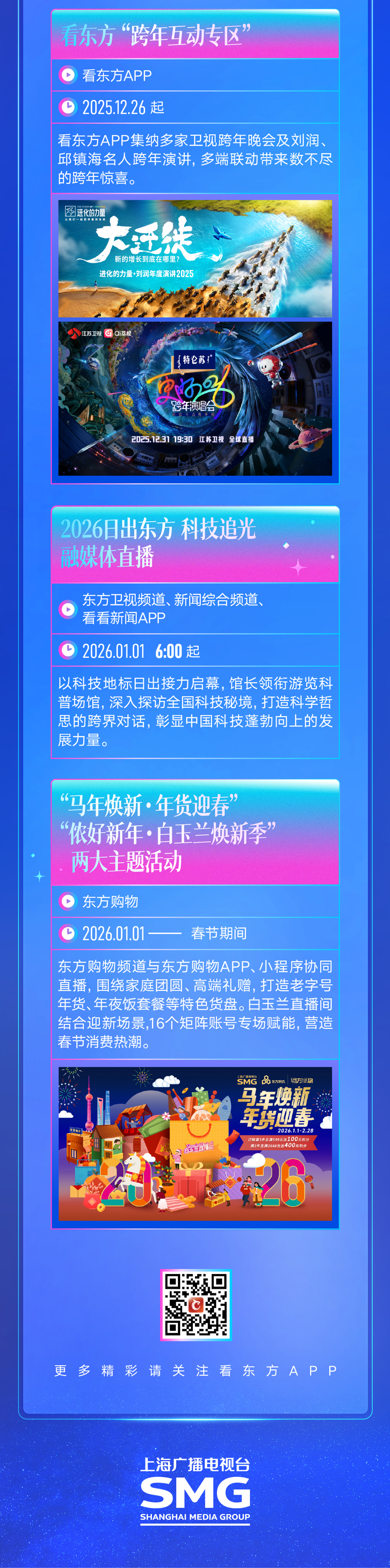跨年盛典进入倒计时,SMG双屏联动,线上线下打通消费入口,一站式搞定你的“看东方 游上海”体验。今天起,“马上系列”八维清单陆续解锁,带你提前剧透2026跨年新玩法!