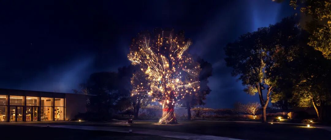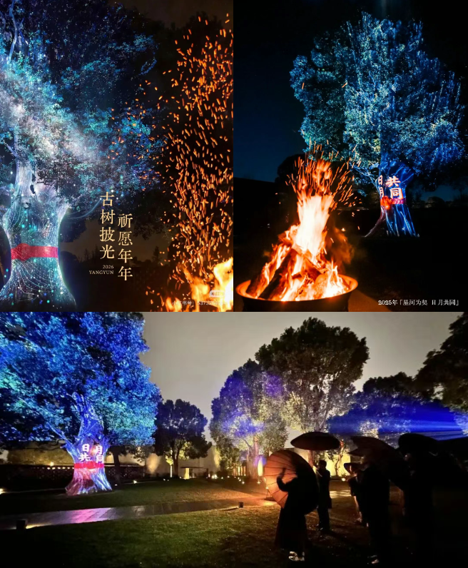 除了呈现千年古树的光影叙事外,幻维数码更以跨年夜为契机,打造了一场极具温度的沉浸式光影互动体验。宾客们于光影流转的古树下亲身参与这场跨年祈福,借由光、树、人三者间的共鸣与交融,完成一次自然、历史与心意的诗意连结。