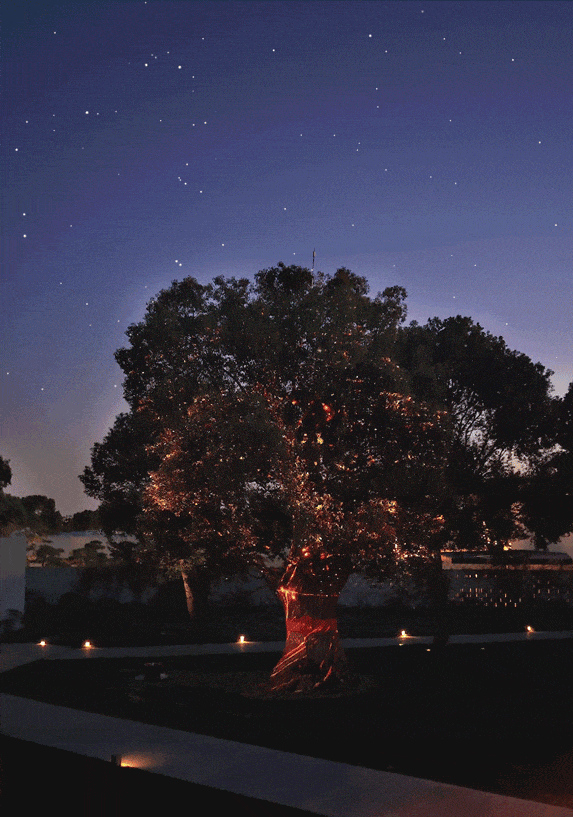 幻维数码围绕养云安缦酒店独有的古建园林展开创意叙事,利用多台高流明投影机,通过复杂的边缘融合技术,让光影完美贴合树干的每一寸肌理,仿佛光就是树生长出来的一部分。从地面而起的点点星光穿梭于叶隙间,最终汇聚成“日月共同”四个大字。用流动的光,在静谧的庭院中谱写出一首生命赞歌,展现“天地人和”的深远境界。