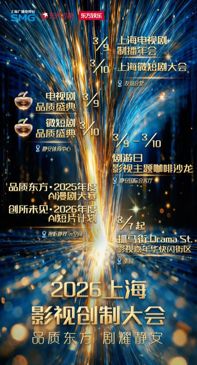 3月9日至10日,上海影视创制大会将以“2+2+3”核心体系重磅登场,全面升级为2026影视行业开年第一“超级大会”。