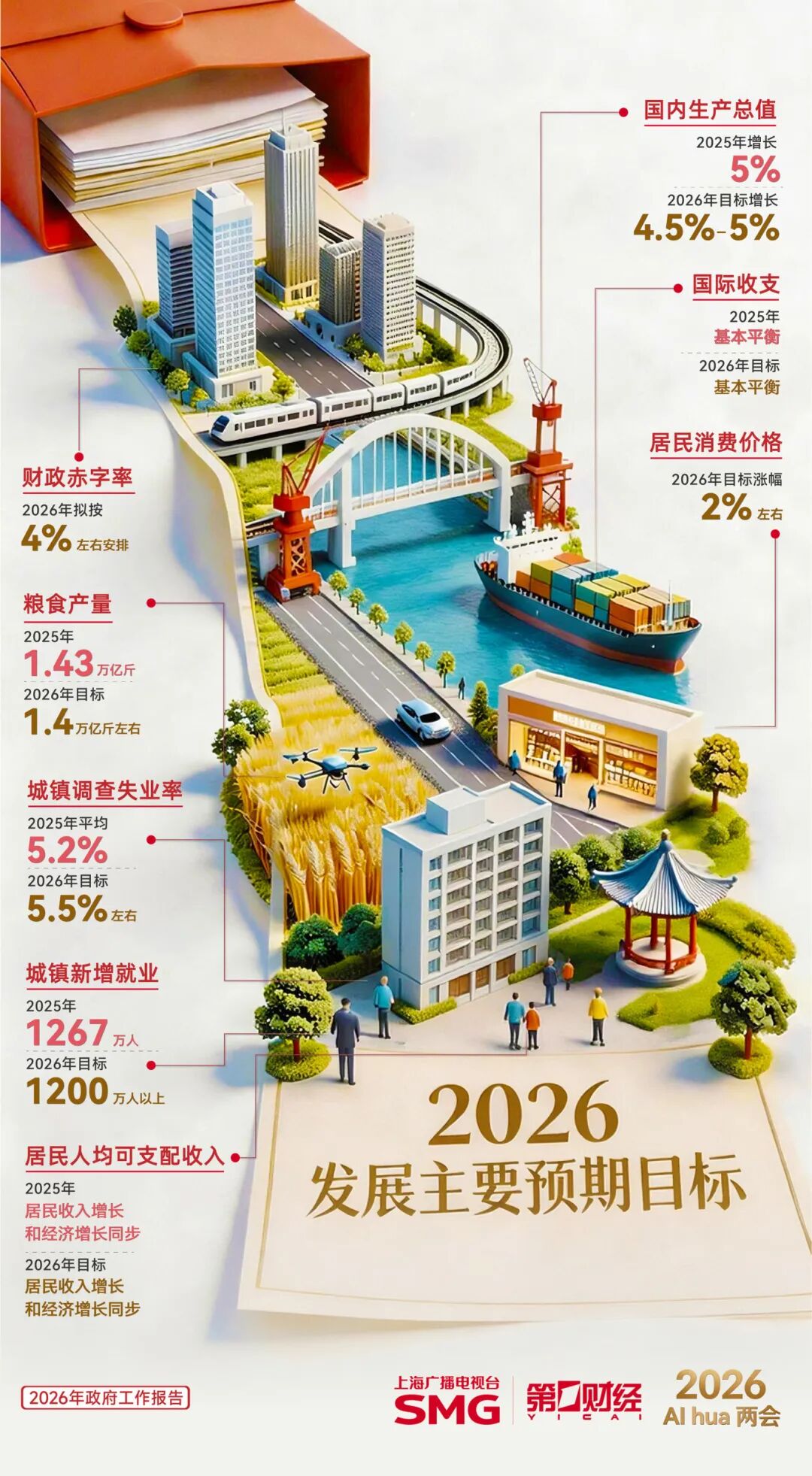 第一财经精心策划“AI hua两会”创意长图,清晰呈现2026发展主要预期目标。作品以“会议文件袋”为创意载体,将收入、就业、消费等关键指标进行可视化、立体化呈现,徐徐展开一幅生机盎然、蓬勃向上的社会发展图景。