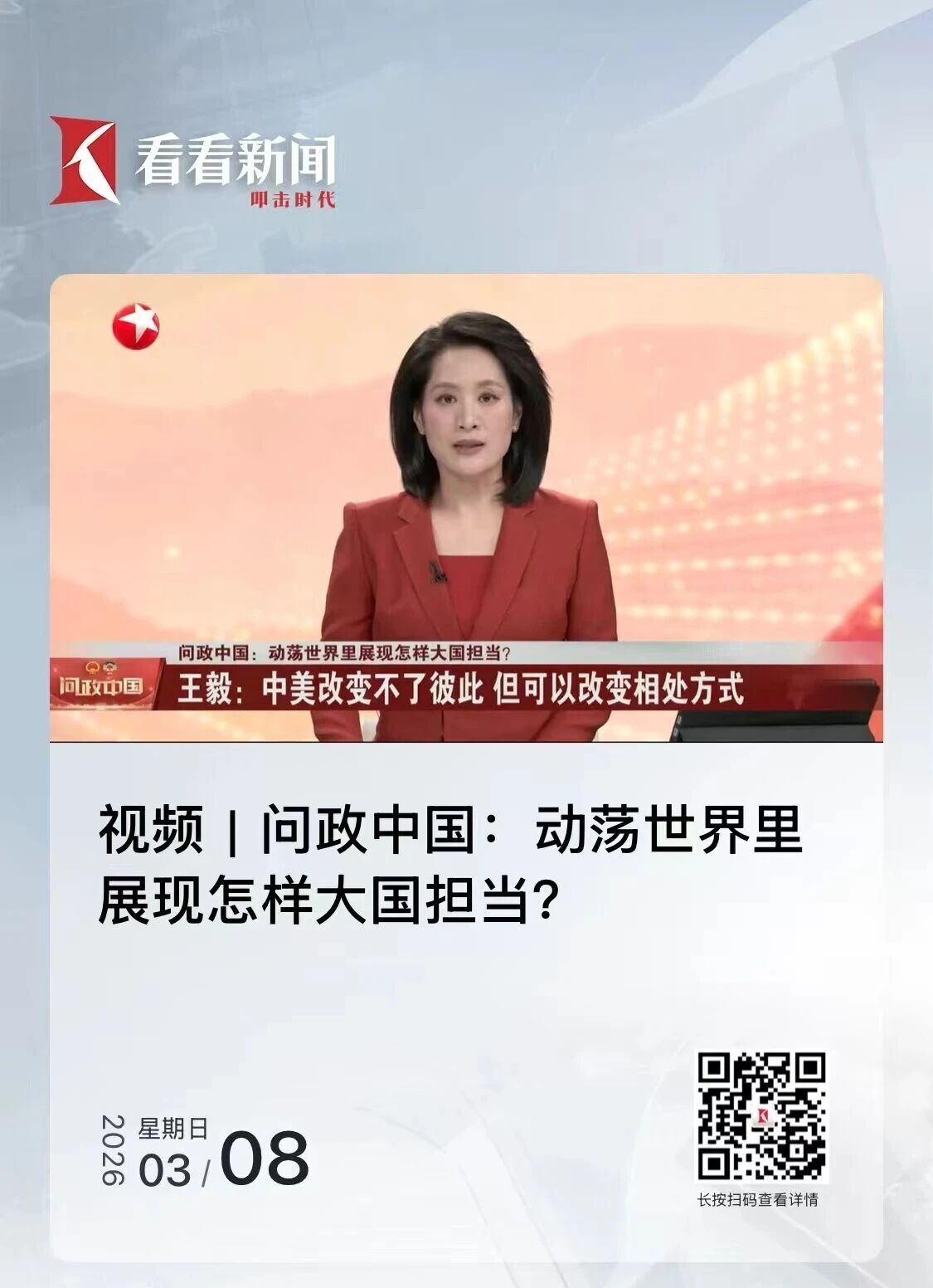东方卫视大型专栏“问政中国”推出第4期《动荡世界里展现怎样大国担当?》紧扣“大国外交”展开硬核解读。通过京沪两地演播室的直播联动,聚焦发布会上王毅外长的发言,围绕“中美关系”“中日关系”“中东局势”“国际多极格局”等核心议题开展深度对话,权威解读外长会在“十五五”开局之年向世界释放出的中国外交重要信号,系统阐释中国外交对世界格局的基本判断与未来走向。