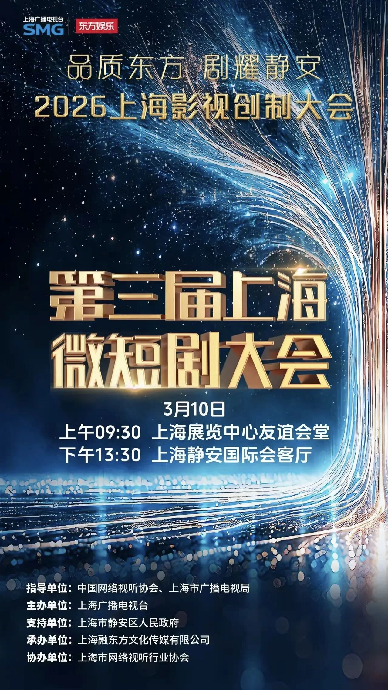本届大会由中国网络视听协会、上海市广播电视局指导,上海广播电视台主办,上海市静安区人民政府支持,上海融东方文化传媒有限公司承办,上海市网络视听行业协会协办。